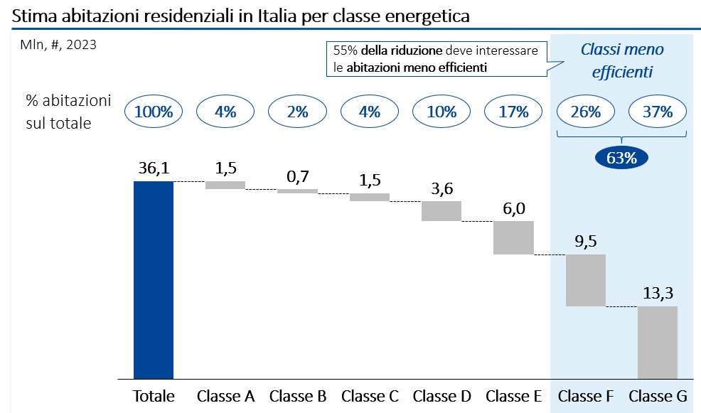 In un contesto in cui l’Italia è strutturalmente molto indietro rispetto agli altri Paesi europei, si stima che per riqualificare il patrimonio immobiliare degli edifici potrebbero essere necessari investimenti dagli 800 ai mille miliardi di euro. Se si analizza la percentuale di immobili di classe energetica F e G, infatti, si vede che in Italia gli edifici appartenenti a questa categoria sono oltre il 60%, mentre in Germania arrivano al 45%, in Spagna al 25% e in Francia appena al 21%.
