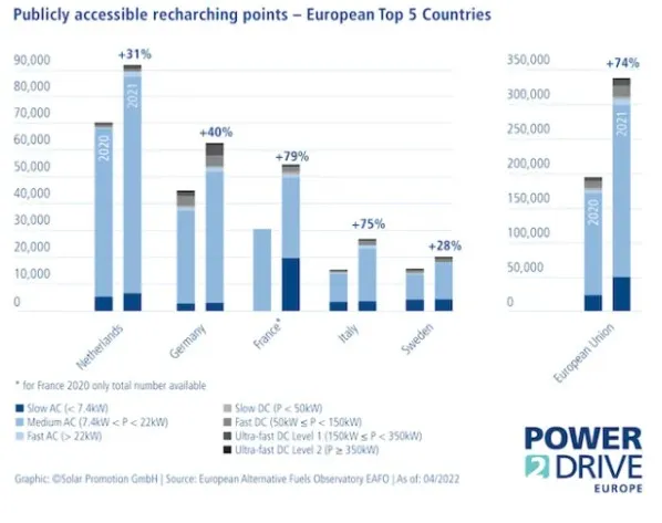 Il nostro Paese risulta però il secondo come tasso di crescita delle infrastrutture ad accesso pubblico: +75% rispetto al 2020. Al primo posto la Francia (+79%), seguita dalla Germania (+40%), Olanda (+31%) e Svezia (+28%). Complessivamente in Europa i dati Eafo confermano la presenza di circa 340mila punti di ricarica pubblici, con una crescita del 74% rispetto al 2020 (meno di 200mila).